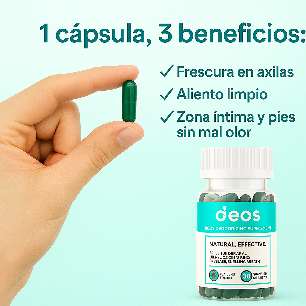 Deos es un suplemento natural diseñado para ayudar a reducir olores corporales desde su origen y apoyar una sensación de frescura durante el día.